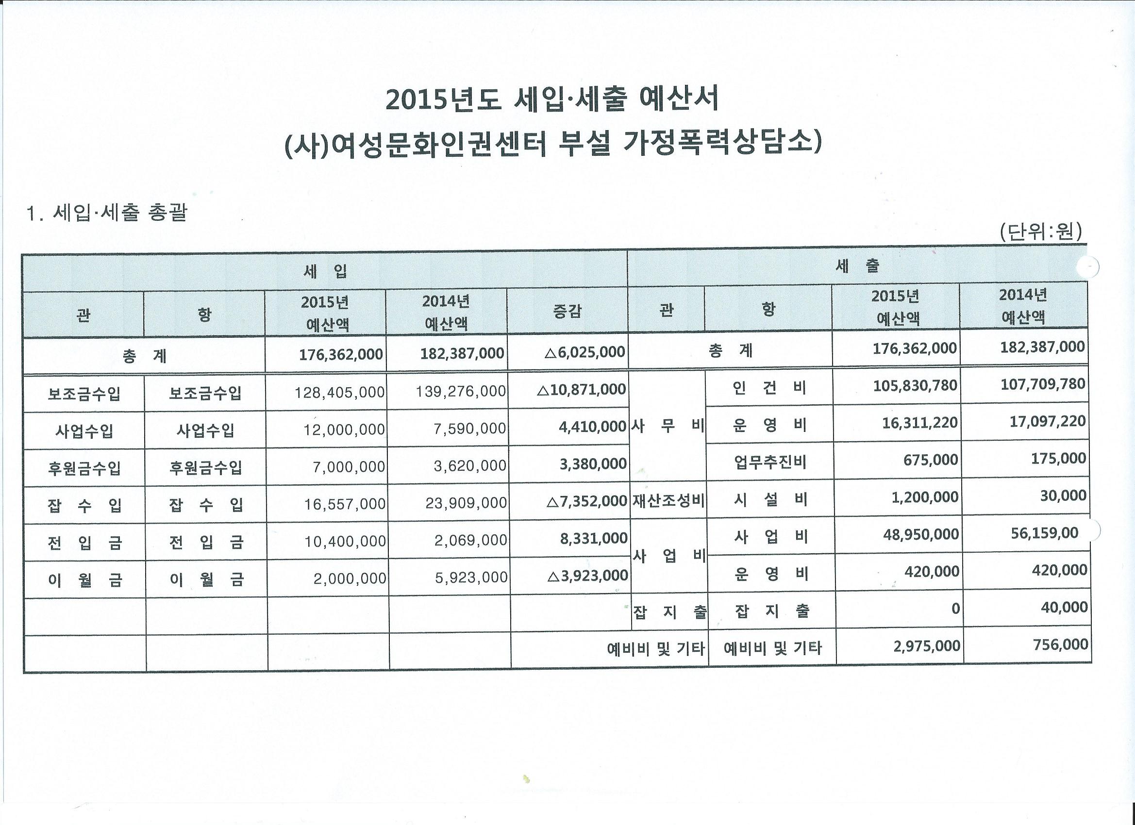2015년 가정폭력상담소 세입. 세출 예산서 입니다,