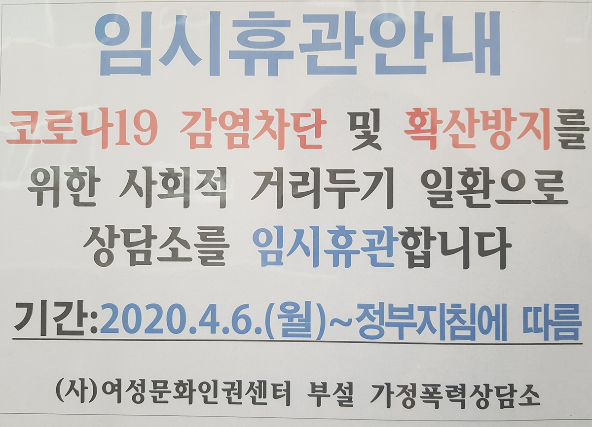코로나 19 확산으로 인한 가정폭력상담소 휴관3차연장